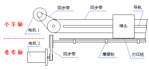 如下圖,噴繪機的機械結構為皮帶傳動,分為小車軸和卷布軸: